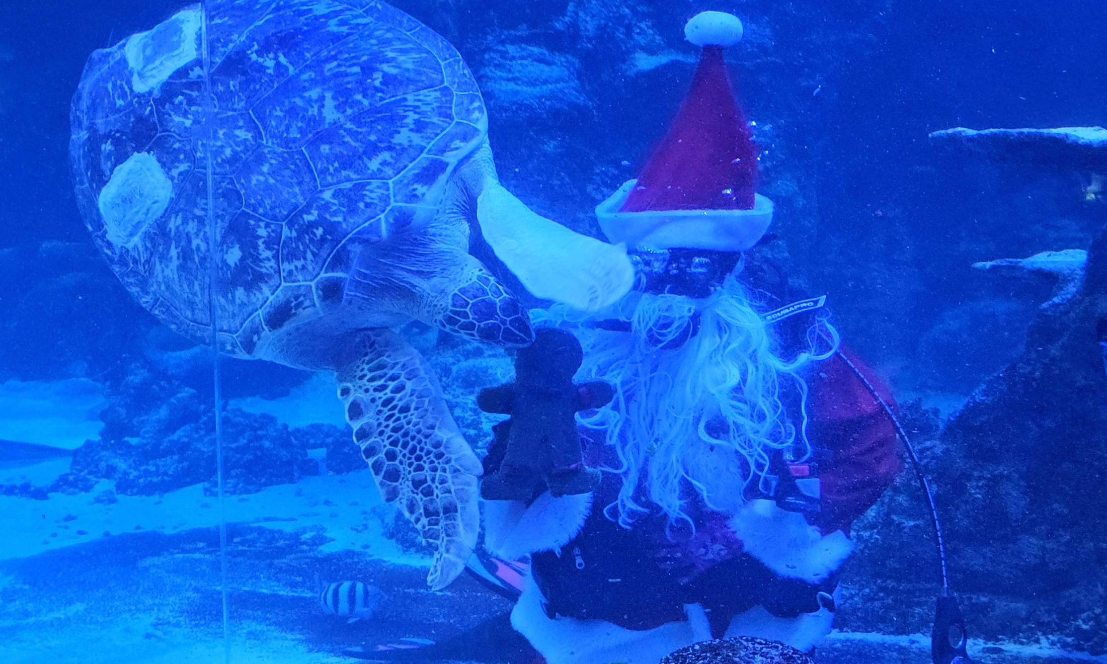The Tropical Ocean Exhibit is home not only to Benson, but also to sharks, stingrays, and thousands of tropical fish — many of which eagerly cleaned up crumbs Benson left behind during his holiday feast.